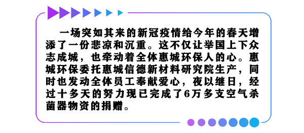随后,装载五万支杀菌器的车辆启动,它将承载全体惠城环保人的爱心,驶达最急需的防疫一线。