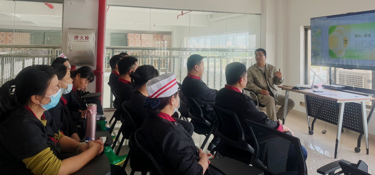 随后,HSE管理部安全员朱宏杰于职工书屋对厨房工作人员进行安全教育,从厨房危险源辨识、事故预防、设备操作等方面详细地进行讲解,他强调:“大家一定要重视电、火、器具的使用安全,注意安全是对自己负责,也是对他人负责。在厨房无论进行什么工作都需要严肃认真,思想集中,比如在油锅加热过程中不可离开,在斩切食物时不得与他人交谈,养成良好的习惯,确保自己和他人的安全。”